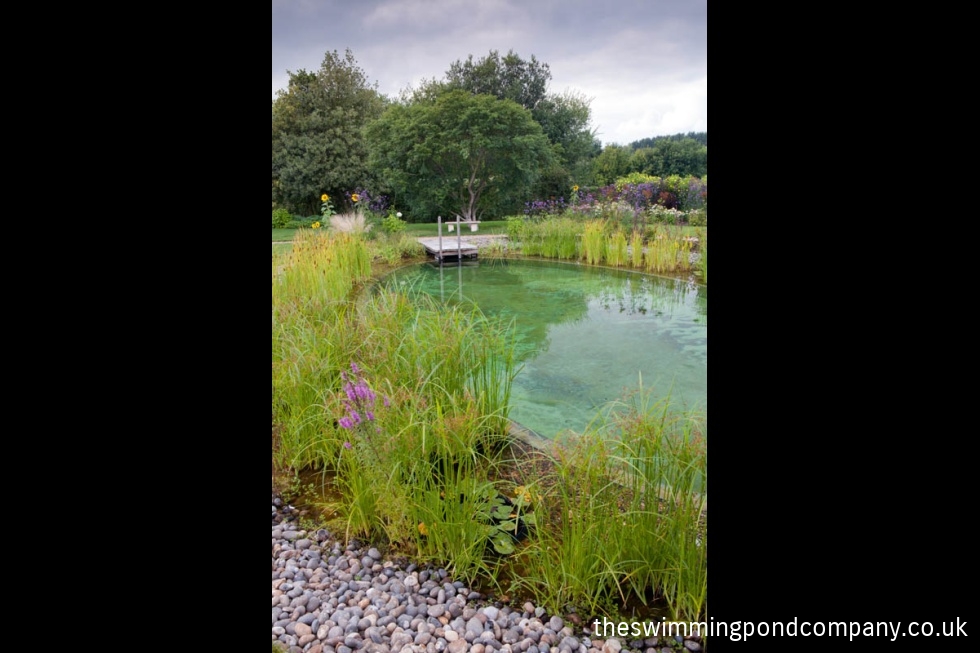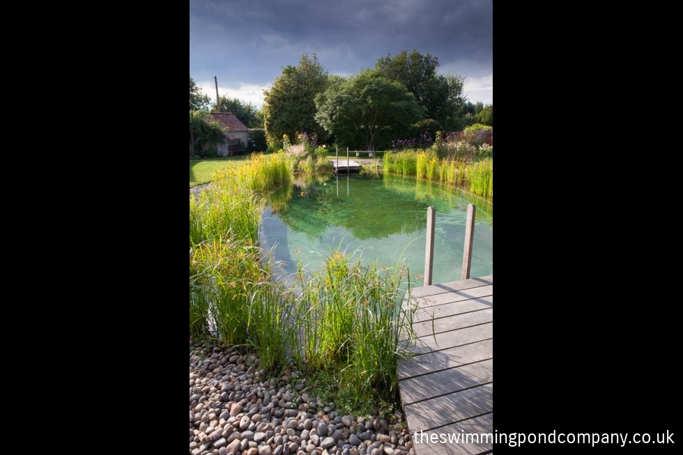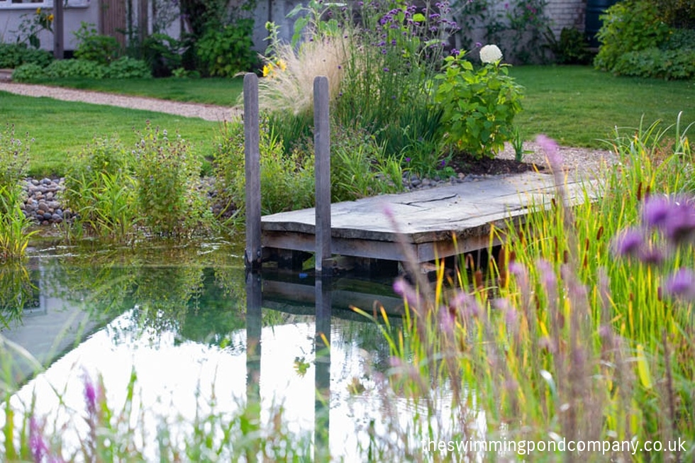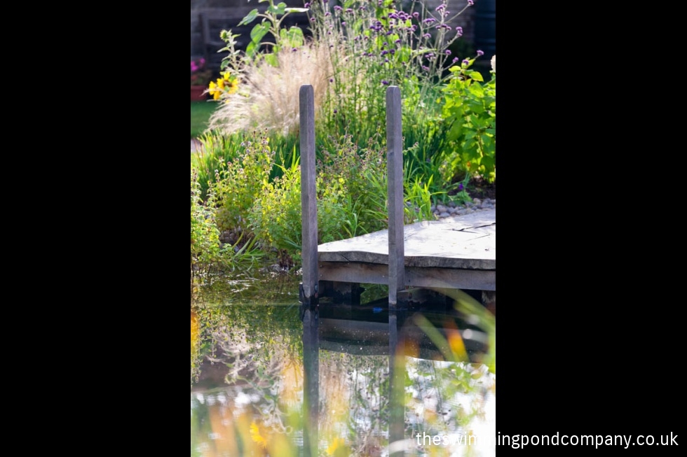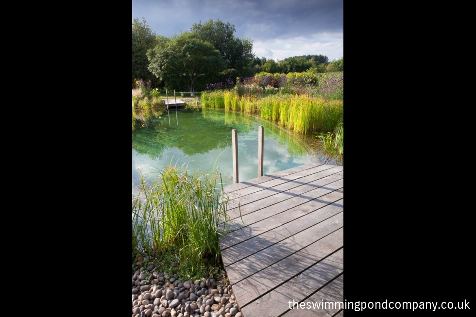 An oak deck has been positioned at the eastern end in the shade of the existing willow, which makes it a particularly lovely spot to sit in, on a hot summer’s day. A set of bespoke green oak steps provides access to and from the water from the deck. The sawn oak planks have been used to build a jetty at the opposite end of the swimming pond. The jetty also provides access to the swimming area and sits over the regeneration zone. Cobbles define the outer edge of the regeneration zone, which adds another feature to the semi-formal character of this pond.