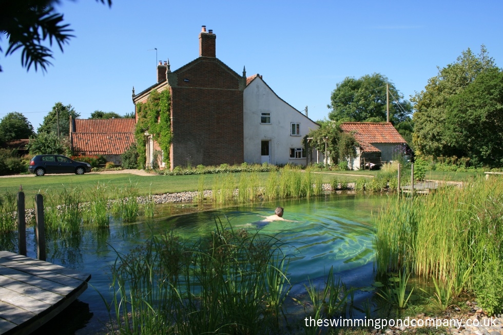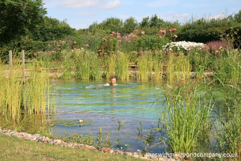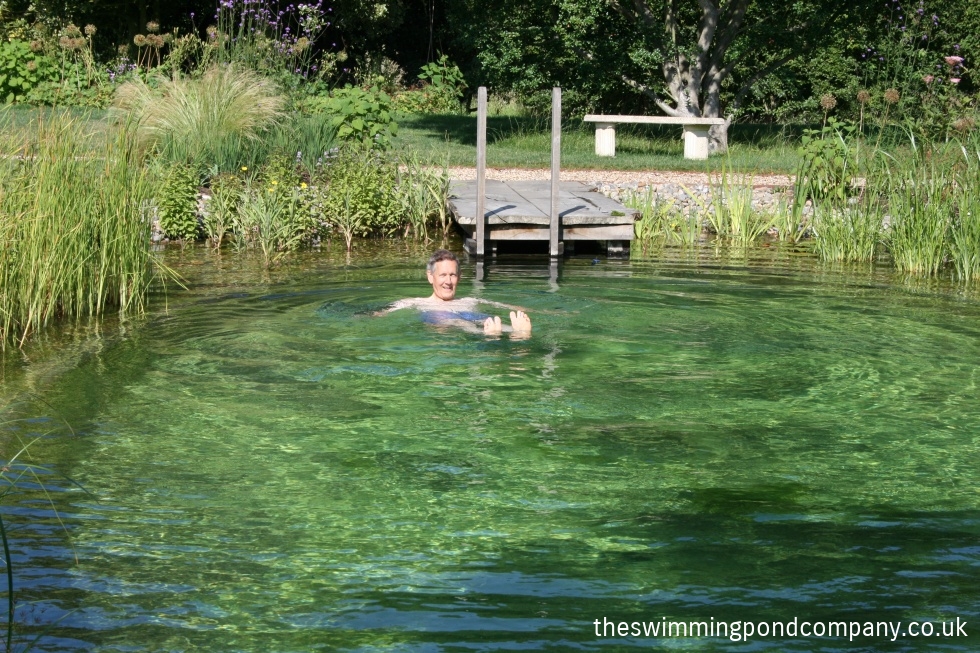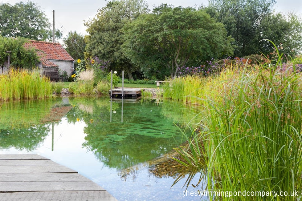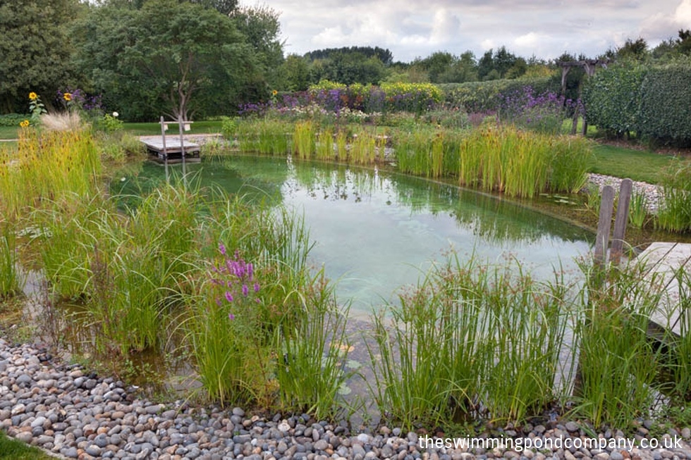 An oak deck has been positioned at the eastern end in the shade of the existing willow, which makes it a particularly lovely spot to sit in, on a hot summer’s day. A set of bespoke green oak steps provides access to and from the water from the deck. The sawn oak planks have been used to build a jetty at the opposite end of the swimming pond. The jetty also provides access to the swimming area and sits over the regeneration zone. Cobbles define the outer edge of the regeneration zone, which adds another feature to the semi-formal character of this pond.